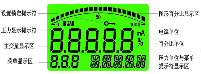 4.2.2調(diào)滿鍵“S” ?測量模式下短按為顯示模式修改功能。 ?測量模式下長按5秒為進(jìn)入調(diào)滿功能(即標(biāo)定變送器滿點(diǎn))。 ?設(shè)置模式下為設(shè)置參數(shù)加一功能,長按時(shí)連續(xù)移位加一。 4.2.3調(diào)零鍵“Z” ?測量模式下短按為顯示模式修改功能。 ?測量模式下長按5秒為進(jìn)入調(diào)零功能(即標(biāo)定變送器零點(diǎn))。 ?設(shè)置模式下為設(shè)置參數(shù)移位與減一功能,長按時(shí)連續(xù)移位或減一。 4.2.4按鍵功能綜述 儀表通過面板的三個(gè)按鍵實(shí)現(xiàn)所有的參數(shù)輸入和校準(zhǔn)數(shù)據(jù)的設(shè)置、采集,本儀表的設(shè)置和輸入采取了多種優(yōu)化措施來提高客戶的操作速度: ?儀表的移位鍵和增加鍵具有變速率功能。 ?儀表同時(shí)具有移位和增量輸入方法,針對(duì)需要大量數(shù)修改的菜單使用移位方式,需要連續(xù)輸入數(shù)據(jù)的菜單采取了增量方式。 ?儀表在設(shè)置狀態(tài)下會(huì)停止模擬輸出,所以如果60秒內(nèi)用戶沒有操作儀表,則會(huì)自動(dòng)退出到測量狀態(tài)。 ?儀表在正常退出菜單的時(shí)候才會(huì)保存所有設(shè)置的參數(shù)。 4.3快捷功能 ?儀表有主變量清零,零點(diǎn)有源遷移,滿點(diǎn)有源遷移三種快捷功能,便于用戶現(xiàn)場的快速設(shè)定。 4.3.1主變量清零 主變量清零即PV清零,是相對(duì)大氣壓下的零點(diǎn),不是傳感器量程的零點(diǎn)。將變送器直接置于大氣壓下,長按“M”鍵5秒以上,即可進(jìn)入主變量清零功能,如右圖,菜單區(qū)顯示“P=0”,通過“S”鍵和“Z”鍵選擇需要進(jìn)行的操作,提示符區(qū)相應(yīng)顯示: